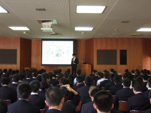 講師は,ベネッセコーポレーションの大竹裕貴先生です。高校卒業後の進路…大学,専門学校,就職…による違いについての話から始まり,将来(大学を出てから)就職するためには何が重要なのか,そして大学に合格するために今しなければならないことは何か,など,具体的にわかりやすくお話ししてくださいました。また,4月入学早々行ったスタディサポートの結果の見方について,これからの高校生活をどう過ごしていくべきかなど,生徒にとって切実な課題についてお話しがありました。