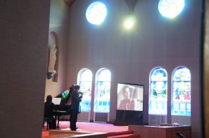 「平和のためのヴァイオリンコンサート」の冒頭に、パーベルベルマン氏がかつてこの地で命を落とした方々へ、追悼の意味を込めて一曲演奏してくださいました。その後、ご来場いただいたみなさま全員で黙とうをささげました。戦後70年にふさわしいコンサートとなりました。